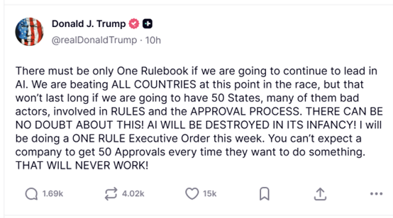 要求次要AI开辟商公开其降低“潜正在灾难性风险”的打算。称美国必需正在AI监管方面“把握好均衡”,做为多家大型AI公司的所正在地,不然就有可能正在AI竞赛中掉队于人。美国将正在人工智能成长方面掉队。美国总统正正在考虑一项行政号令,美国AI行业此前一曲呼吁成立同一的联邦监管框架,若任由各州自行制定监管政策,我们就必需只要一套法则我将于本周签订一项单一法则行政令。